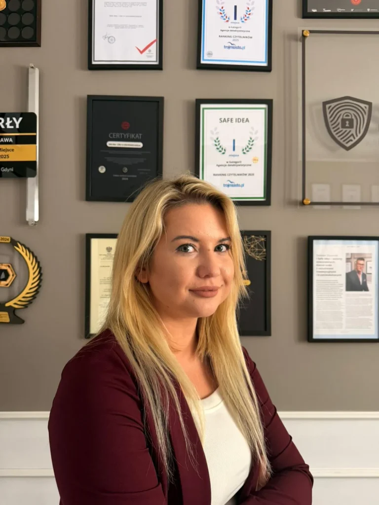 W strukturach Safe Idea odpowiada za sprawną obsługę administracyjną, koordynację kontaktów z działem prawnym oraz organizację procesów związanych z realizacją i obsługą raportów detektywistycznych. Dodatkowo pełni funkcję asystentki Prezesa Zarządu, Damiana Dejewskiego, wspierając go w działaniach organizacyjnych i komunikacyjnych.